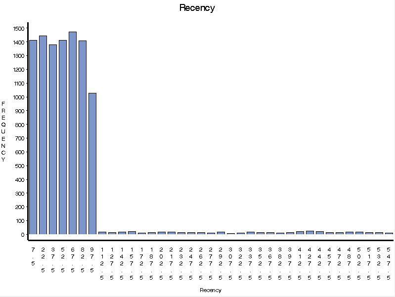 - Variable MONETARY – the average total amount of sales to a person in the last 12 months is 926€. We can also see that this variable is also highly positively skewed, which indicates that there should be a lot of customers buying small amounts while a small number of customers buy huge amounts. That is confirmed by a mean of 383€ and the standard deviation. We can see that RECENCY follows the same trend.